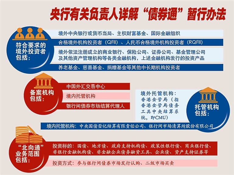 答:发行人在银行间债券市场通过系统招标或簿记建档发行债券时,符合中国人民银行要求的境外投资者可通过“北向通”机制安排参与相关债券的认购。境外托管机构以其开立在境内托管机构的名义持有人账户代境外投资者持有认购的债券,具体可参照境内外托管机构有关规则及业务指南。下一步,我们将不断推动有关规则及业务流程与国际接轨,更加便利境外投资者参与中国债券市场。