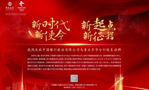 2018年12月29日,中国银行乌鲁木齐市分行在中银大厦30楼举行恢复挂牌活动,这是中国银行“扁平化”管理体制改革的重要举措,标志着中国银行在乌鲁木齐地区体制改革的全面完成,中国银行将以更全面、更高效、更精准的服务支持首府经济社会各项事业发展。