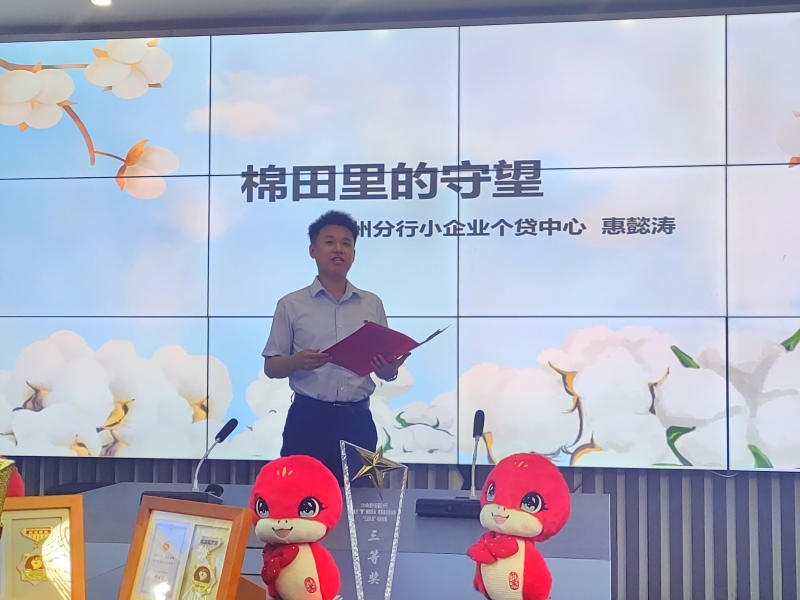建设银行博州分行小企业经营中心(个人贷款中心、普惠金融事业部)客户经理惠懿涛讲述《棉田里的守望》生动故事。闫毓婷 摄