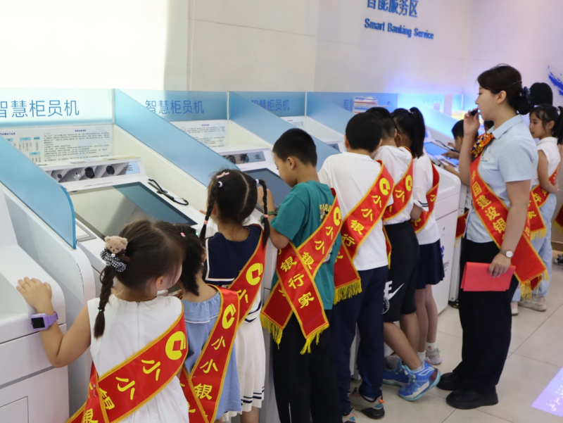 在情景体验环节,支行巧妙地将营业场所转化为沉浸式学习空间。学员们首先来到现金业务区,在柜员的耐心指导下,亲手办理“零钱兑换”业务。从识别币种、清点数额到填写凭证,每个步骤都做得有模有样。随后,孩子们移步智能服务区,亲身体验STM智能柜员机、ATM等设备的操作。通过模拟办理开户、查询等业务,他们不仅感受到了科技给金融带来的便捷,更对现代银行业务流程有了直观认识。最引人入胜的是大堂经理角色扮演环节,孩子们披上绶带,学习标准站姿、微笑服务和礼貌用语,在工作人员的带领下参与客户分流引导。通过“服务7+7”情景演练,孩子们掌握了迎接客户、业务咨询、引导分流等基本服务流程,不仅学到了金融知识,更培养了沟通能力和服务意识。在短短二十分钟内,小朋友们成功实现了从客户、柜员到大堂经理的三重角色转换,这种全方位的体验让他们对银行服务有了更深入的理解。