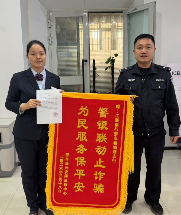 莎车县公安局反诈中心近日专程前往工商银行莎车支行,送上印有“警银联动止诈骗为民服务保平安”的锦旗及感谢信,对该支行在反诈工作中的快速响应和有效处置给予高度肯定和表彰。此次成功拦截涉诈资金,正是工行莎车支行深入践行金融工作政治性、人民性,依托“新时代金石榴消保先锋”枫桥工作站,筑牢金融安全防线的一个生动缩影。