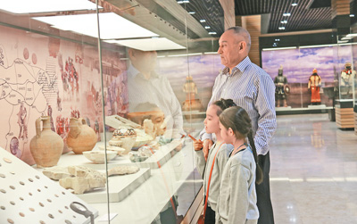 在哈萨克斯坦国家博物馆内,一位长者带着两个小朋友在古丝绸之路文物陈列柜前驻足欣赏。