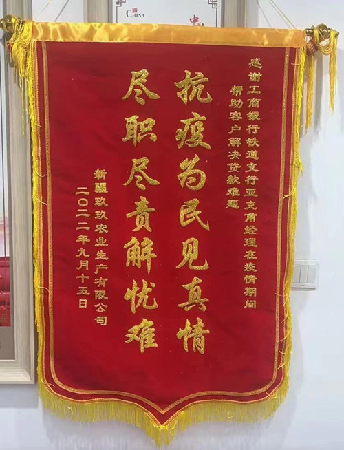 (新疆玖玖农业生产有限公司向工商银行乌鲁木齐铁道支行送锦旗致谢)