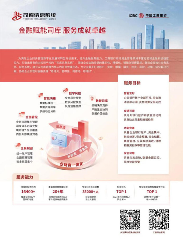 推介会上记者了解到,为满足企业财务管理数字化转型升级需求,工商银行依托资金管理领域丰富服务经验和金融科技雄厚实力,打造出具有自主知识产权的“司库信息系统”,围绕企业财资管理集约化、精细化、智能化升级要求,联动企业核心业务系统、财务系统等,建立以司库管理为核心的财资管理生态,为企业量身打造监控、运营、流程、战略及资源配置一体化解决方案,协助企业实现对多银行账户、资金,票据、融资等金融资源“看得见、管得住、调得动、用得好”,实现“业务—资金—财务”的一体化流程处理及业务高效协同。